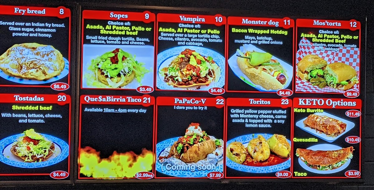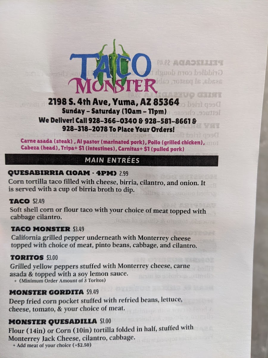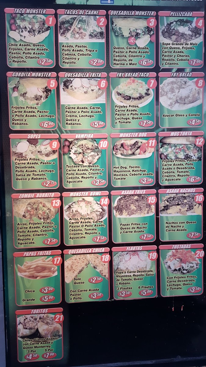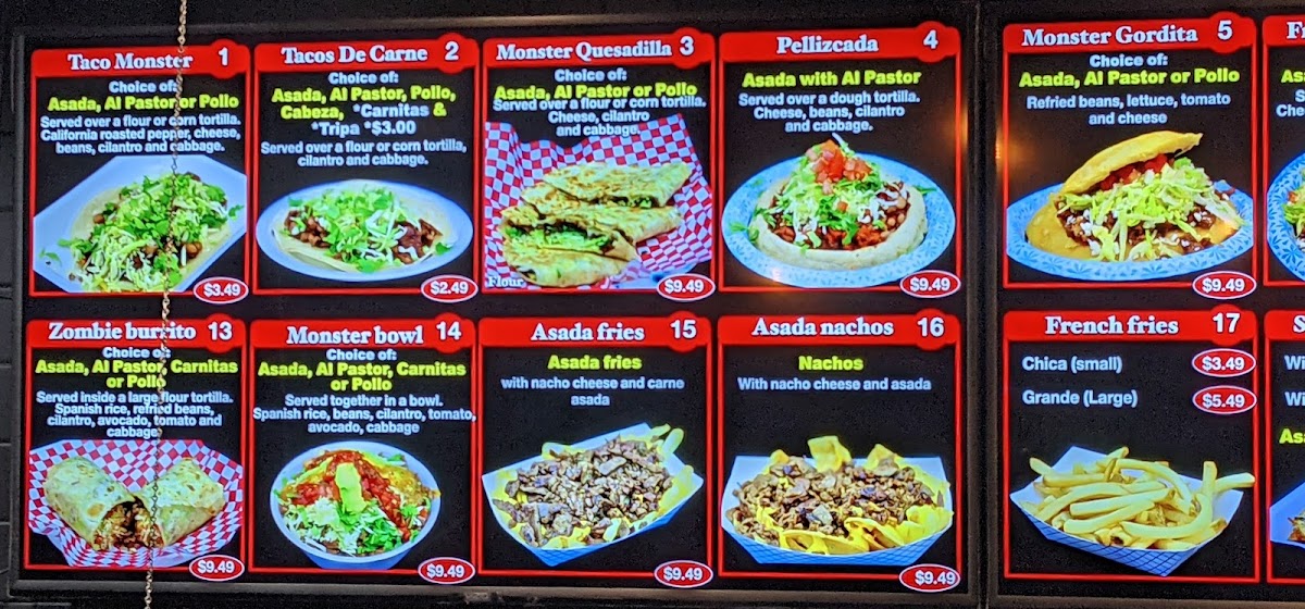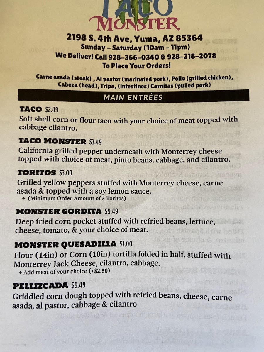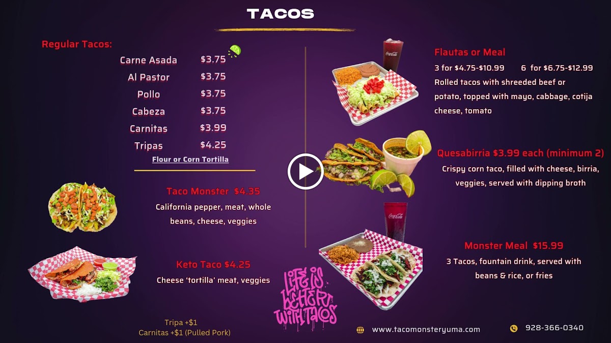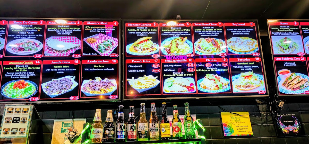 At Taco Monster, you'll find a menu that’s as bold and exciting as its name. Located in Yuma, AZ, this vibrant spot brings the flavors of classic Mexican cuisine with a twist. Whether you're craving tacos piled high with fresh toppings, or a delicious burrito stuffed to perfection, Taco Monster Menu offers something for every craving. From zesty salsas to savory meats, each dish is crafted with care and bursting with flavor. Enjoy the perfect combination of spice and zest with each bite, and be sure to explore their wide variety of mouthwatering options. Whether you're a taco enthusiast or in the mood for something new, Taco Monster serves up a memorable experience that’ll keep you coming back for more.